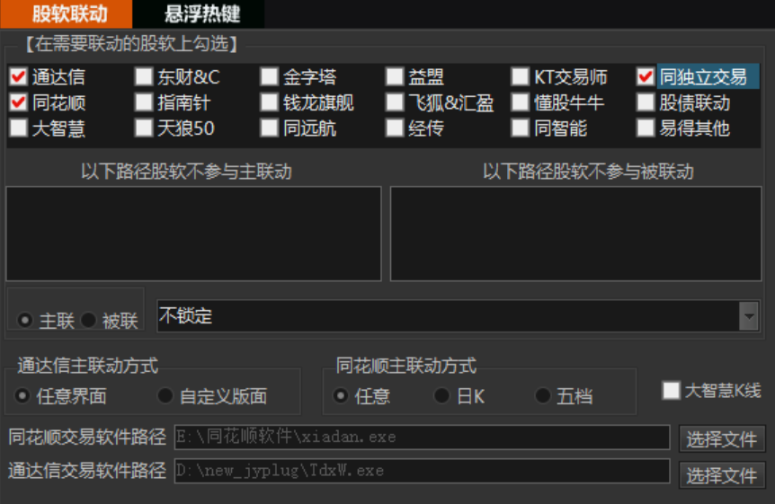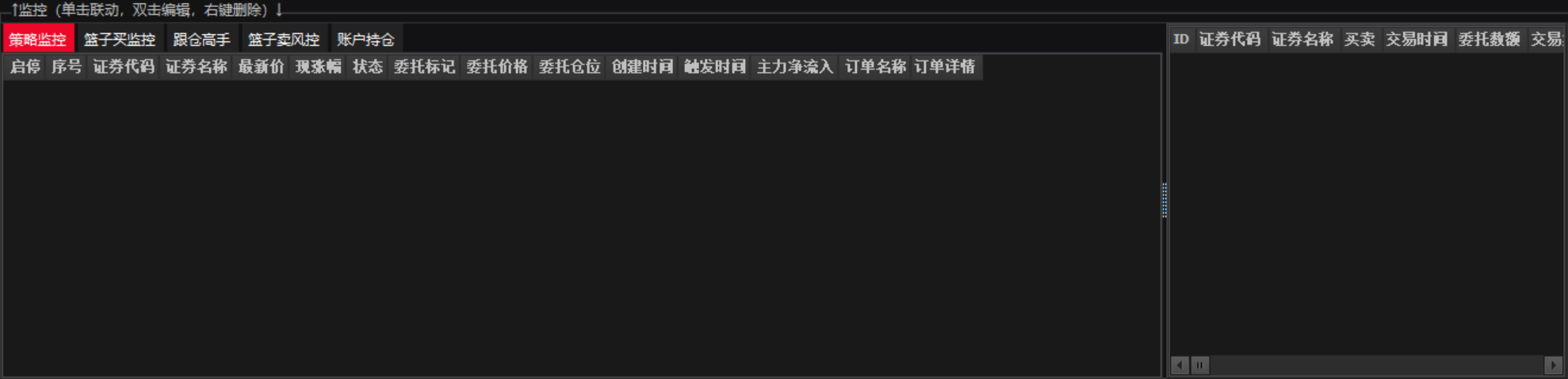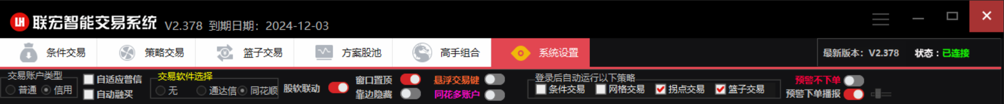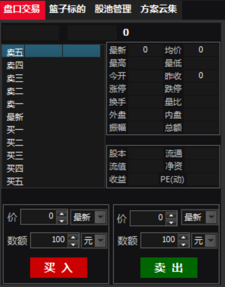 位于软件中部左侧,主要用于核心功能的管理,目前已有盘口交易,篮子标的,股池管理,方案云集,以及系统设置。